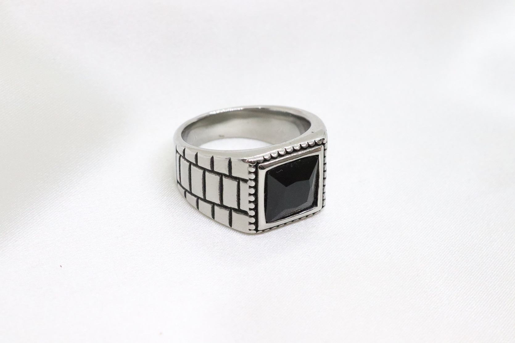 Ατσάλινο δαχτυλίδι με τετράγωνη μαύρη πέτρα και ανάγλυφο σχέδιο