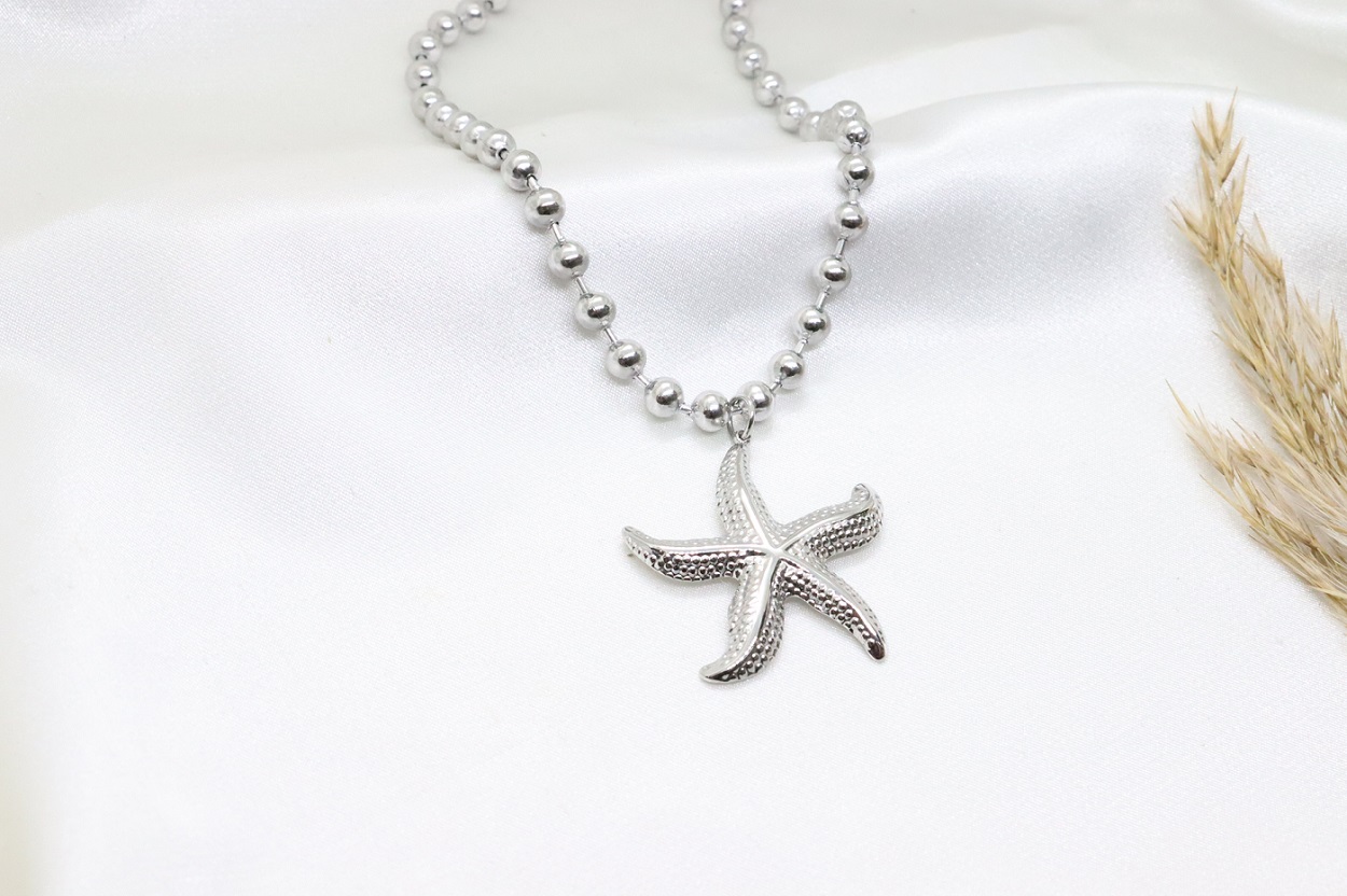 Ατσάλινο κολιέ με μπίλιες και αστερία σε ασημί χρώμα